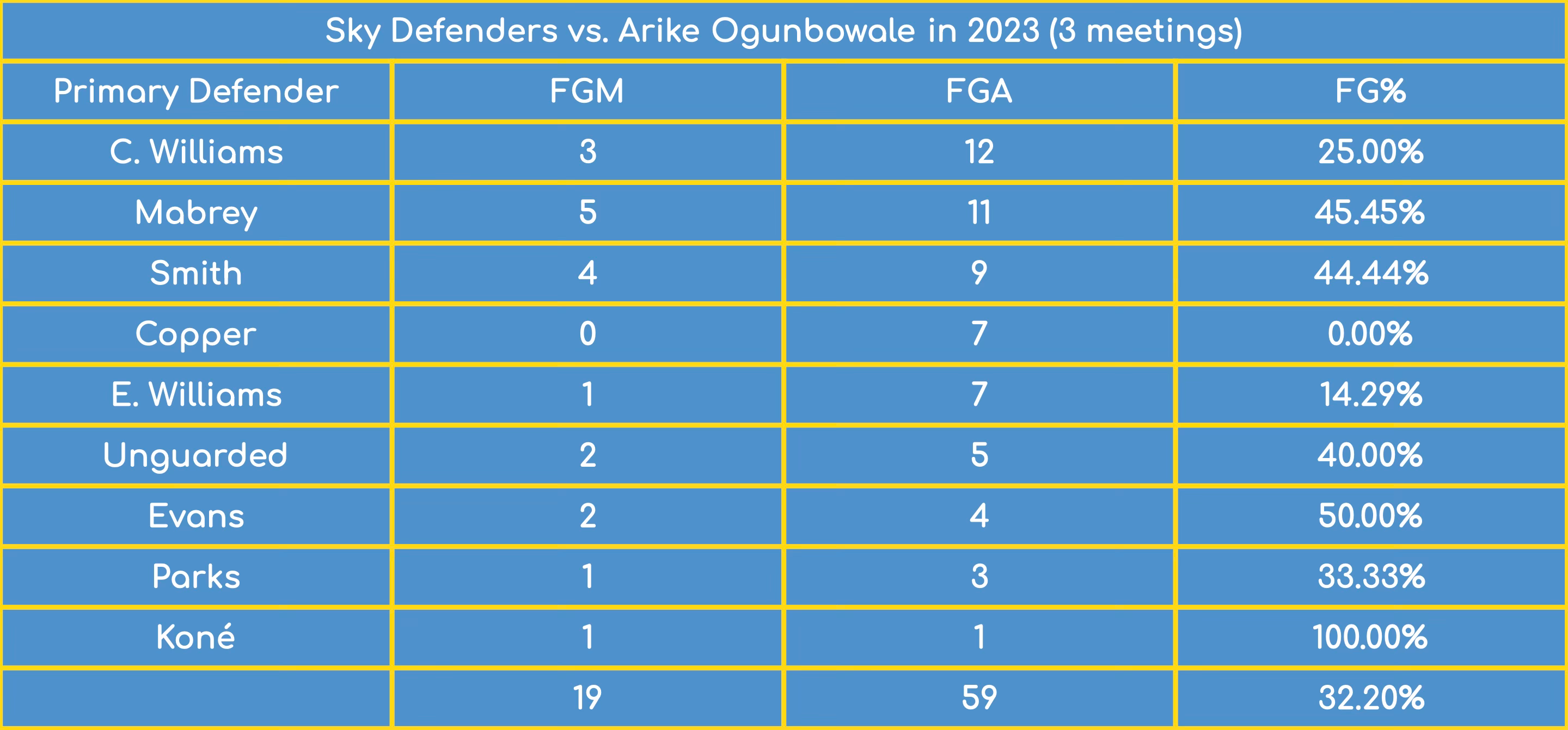Chicago was the only team Dallas went winless against a season ago, and a big part of the Sky’s success was how well they limited Arike Ogunbowale in their three meetings. The Sky held her to just 32% shooting from the floor and 29.9% from long distance and used a variety of defenders and defensive coverages in the process. However, the nature of the Sky’s defense this time around figures to change drastically as Kahleah Copper, who guarded Ogunbowale most in the team’s May meeting, and Courtney Williams, who did the heavy lifting when the teams met twice in August, have both since departed. Marina Mabrey figures to spend the majority of the time guarding her former Wings teammate (and close friend), but the share of the defensive responsibility she takes on could tell us a lot about how Weatherspoon plans to approach defending other elite W guards.