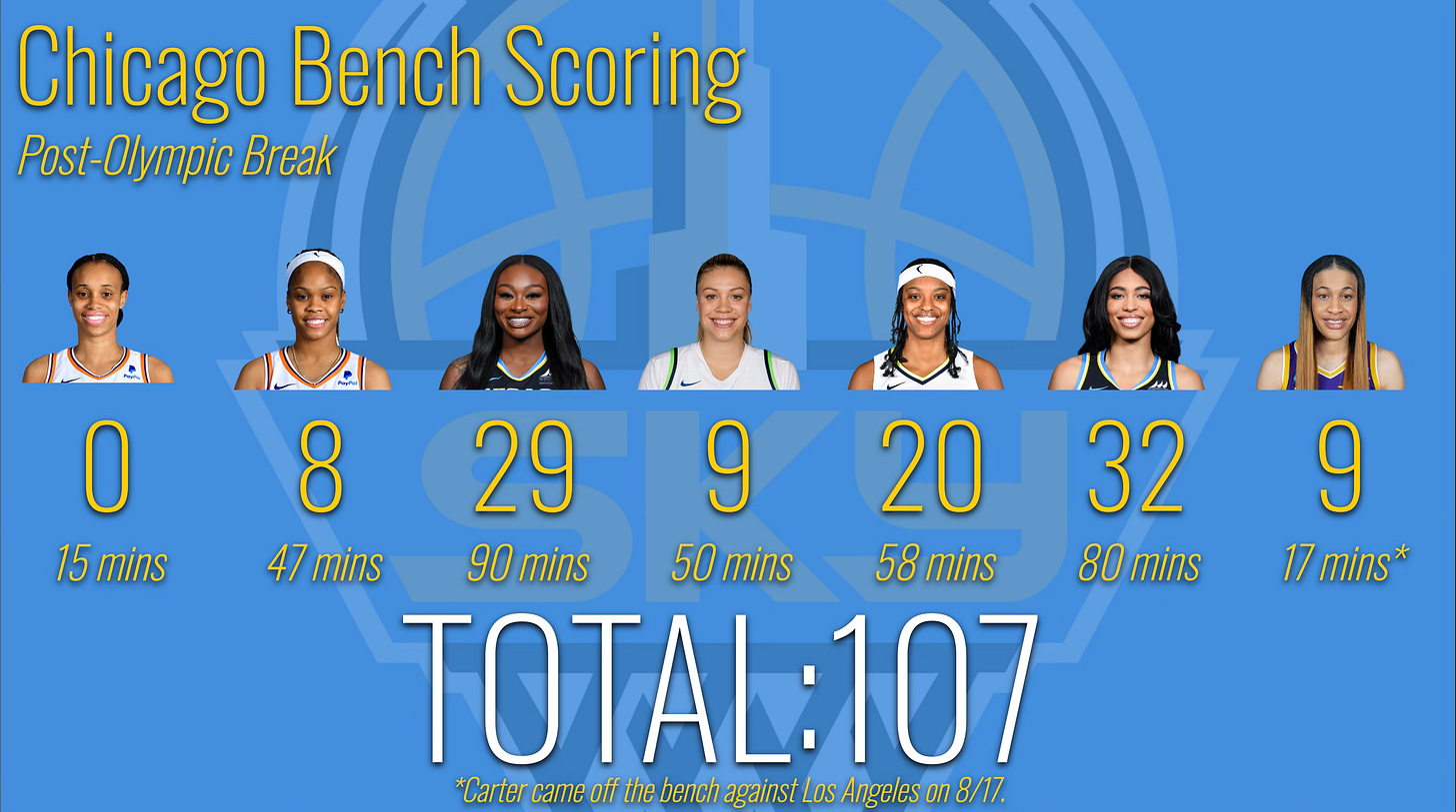 So, what can the Sky do to correct the flaws in their defensive coverages? A couple of areas stand out for improvement, but the biggest correctable one is consistent rotations. While I’ve kicked around the flaws with the Sky’s current rotational patterns a number of times, I’ve never honed in on how damaging it seems to be to the defensive cohesion of the team. While they’re a young team and have made mistakes throughout the season, it seems as if there’s been more wide open shots due to disorganization in the 6 games since the Olympic break than all those that preceded it. Some of that is probably recency bias on my part, but there’s also a presumable correlation between the Sky’s mismatched first-half line-ups and the amount of open looks they’ve conceded in those minutes. Meanwhile, in the second half, the Sky’s defensive performances have been much improved. Not only because their best defenders are on the court for more time but because the Sky’s usual closing 5 played together regularly in the first half of the season and are now playing together nightly for 25+ minutes. Of course, great ball movement will eventually unlock even the tightest of defenses, but the extra chemistry that closing group has (plus, in fairness, the intelligence of the players in it) gives the Sky a chance to make Clark or any other passer’s life that much more difficult. The key for Teresa Weatherspoon is to find some first-half combinations involving her bench players that are reliable enough to play together every game—allowing this chemistry (which, in fairness, takes a long time) to develop as much as possible over the last 10 games.
