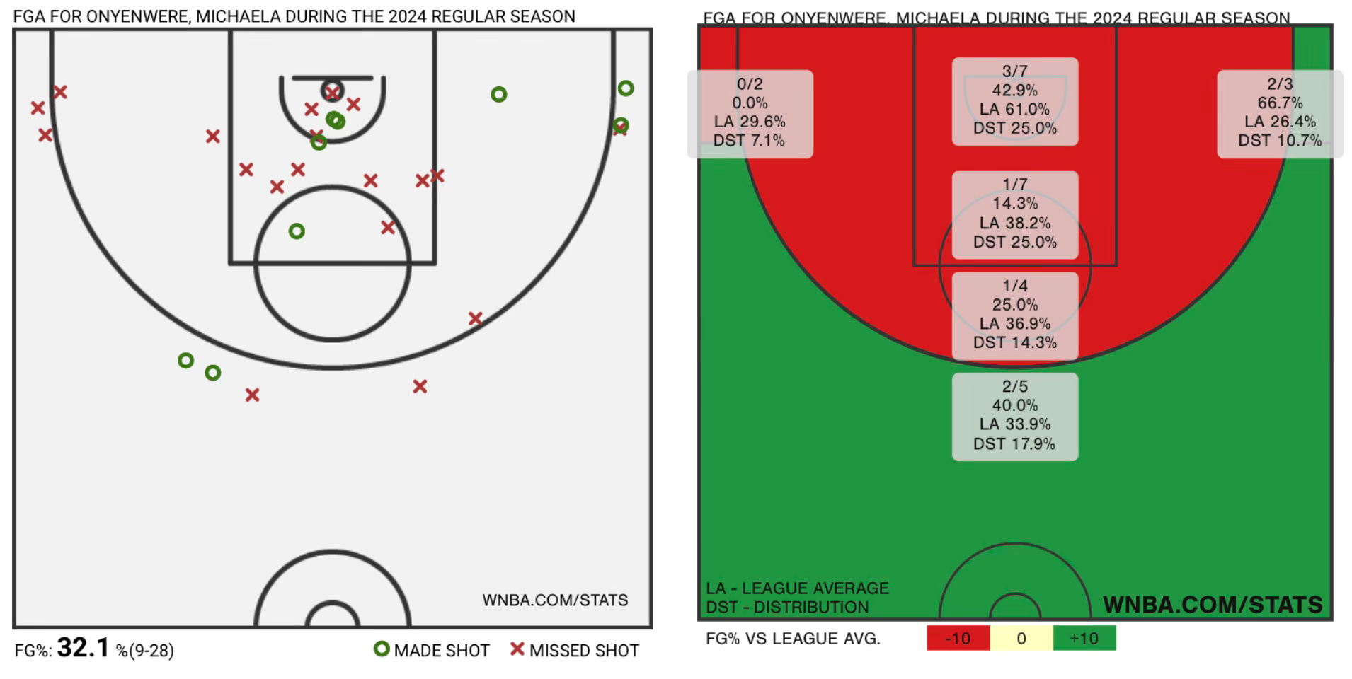Of course, rotations are an imperfect science and, with both Harrison and Cardoso representing recent high-value additions, Weatherspoon has a lot to consider at the moment. Yet, I think relying on the three guard line-ups (as DeShields is, in theory, a guard) for upwards of thirty-minutes per game leaves some important value that only Onyenwere can provide on the table. The tricky part, for both player and coach, is that Onyenwere has had her best offensive performance this season when she got a higher volume of shots. With the way the rotation is currently trending, it’s looking less and less likely that she’s going to consistently get those shots—meaning a lack of rhythm could become a recurring issue. In any case, her size, energy and ability to shoot the three at a semi-reliable clip (4/10 this season) means she provides a lot of things that add value for the Sky. Finding a role for Onyenwere that extracts at least a part of that value while also allowing Weatherspoon’s favored three-guard line-ups to continue thriving could wind up as one of the big rotational challenges of the coach’s debut season.