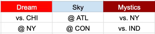 The Sky continue to scoreboard watch after another loss, but the weekend split between the Dream and Mystics means a myriad of playoff possibilities are still on the table. Here’s the remaining schedule for each of the three teams with all now tied at 13-25 after 38 of 40 regular season games:
