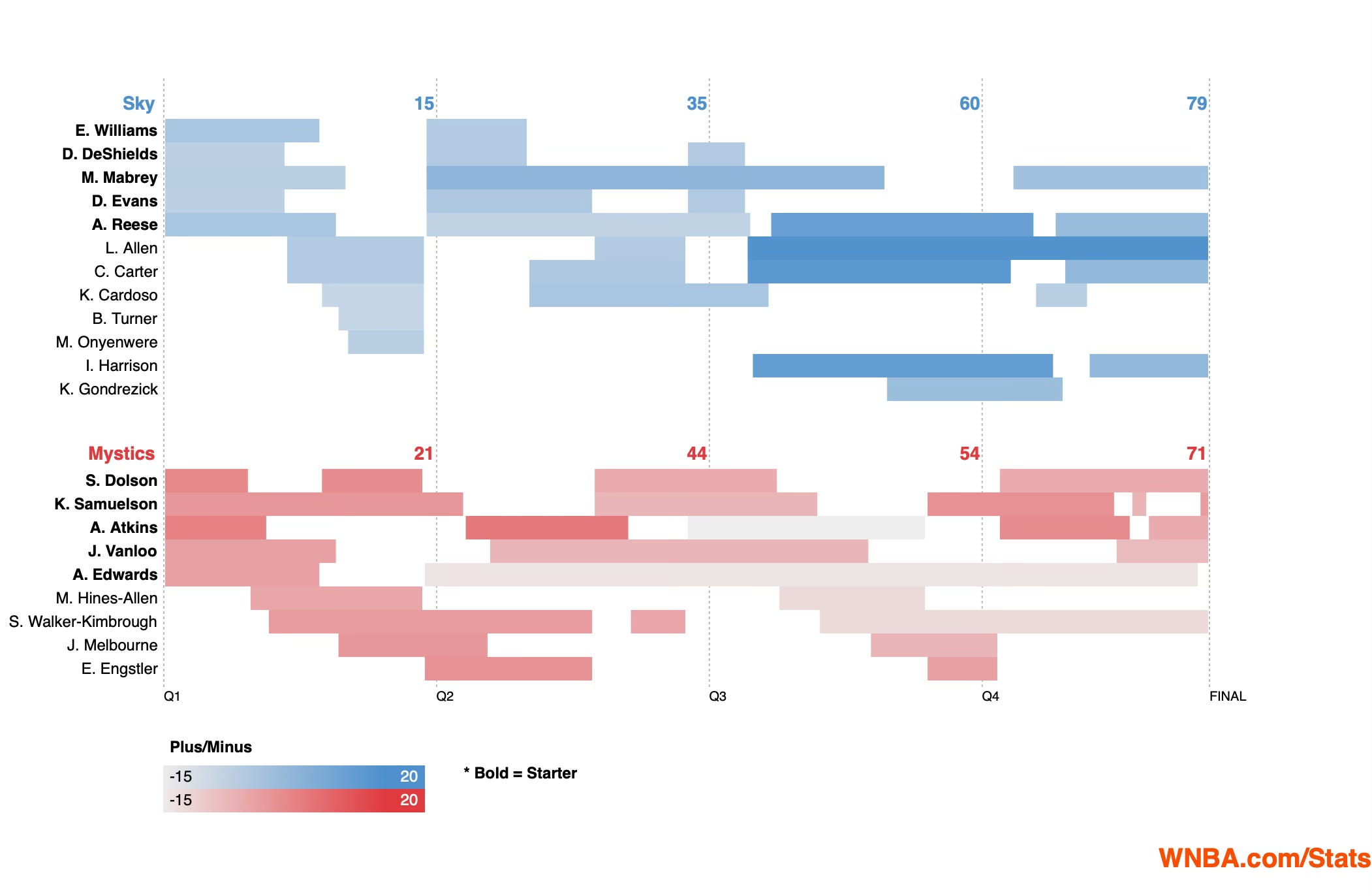 This all culminated at the end of the third quarter when Weatherspoon decided, unexpectedly, to go with Kysre Gondrezick alongside the aforementioned trio and Angel Reese—with that group triggering a 12-4 run that crossed the quarter break and gave Chicago a lead they could manage throughout the fourth. The disruptiveness that five created (13 steals between them) completely destroyed the final shreds of rhythm the Mystics offense had and likely served to dent the young team’s burgeoning confidence entering a fourth quarter that Chicago only narrowly edged. By recentering the team’s play around it’s desired identity, that group, and in particular the trio of Carter, Allen and Harrison, helped the Sky earn a win their offensive performance tonight didn’t justify.
