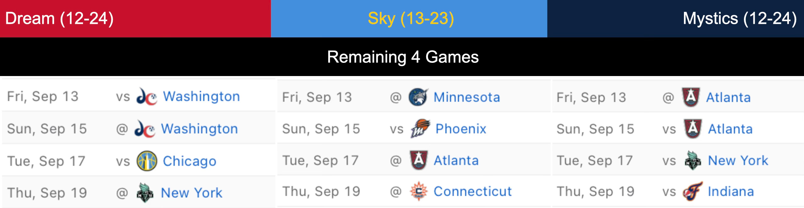 For Chicago, the remaining schedule looks brutal—with a trip to face the equally desperate Dream representing the lone match-up against a team that hasn’t yet clinched a spot in the postseason. Perhaps, if the standings weren’t so tight, the Sky could even hope for Connecticut or Minnesota to rest key players, but the single game gap between the two teams for the second seed means even that respite is unlikely. At this point, the Sky’s most probable path to the playoffs probably involves Washington and Atlanta splitting their weekend series, and the Sky winning the all-important showdown with the Dream next Tuesday. Win that game, and the Sky might be able to afford a 1-3 run to end the season which, given their key absences and difficult second-half, might be all that can be reasonably expected at this point. Of course, the tightness of the standings means that if the Sky can pull even a single upset it could be enough to propel them past the other two contenders for the eighth seed—with the slender one game lead they carry into the final four representing a big advantage amongst a group of three teams that are winning just over a third of their games in 2024.