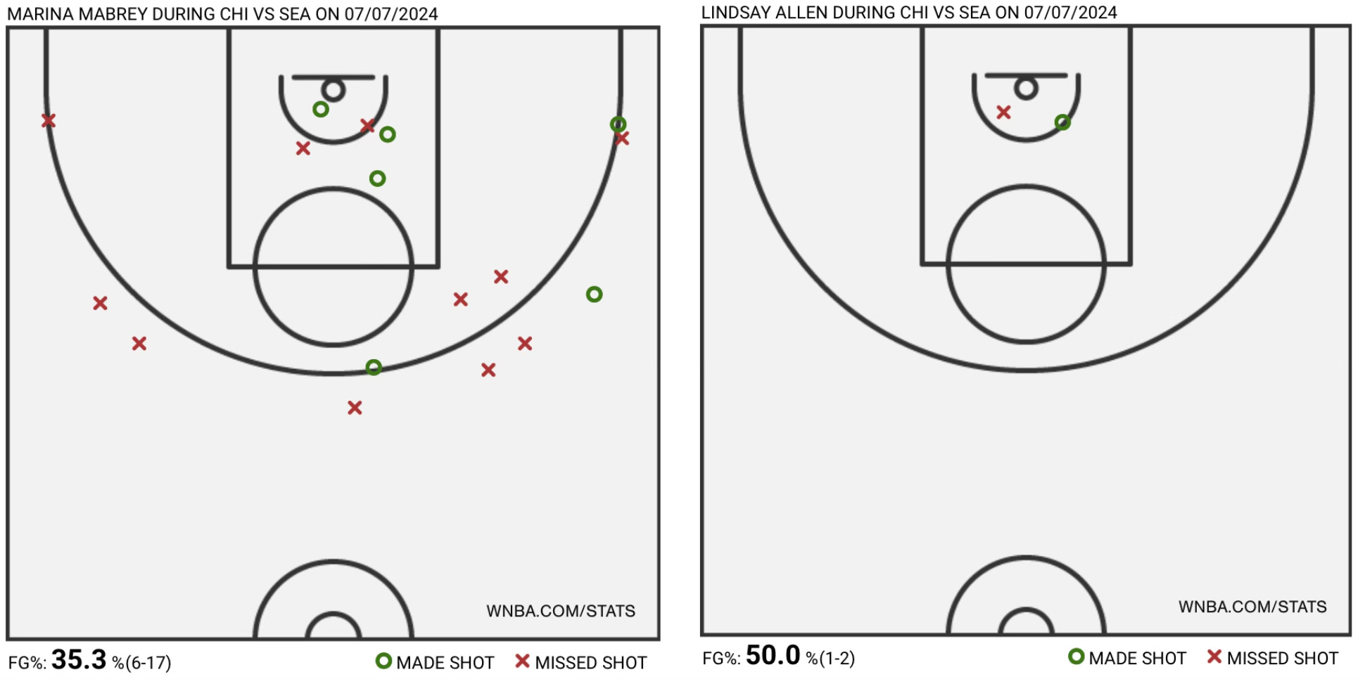 For Mabrey, the problem tonight, and for the last two weeks, is her efficiency. A 6/17 shooting performance tonight actually increased her field goal percentage since June 23rd to 30.5%, and I don’t need to explain why that type of accuracy is not enough for Chicago to rely on her to carry the offense. There’s a feeling, as there was at times in the 2023 season, that Mabrey is missing all of her shots by only a fraction; however, Chicago can only count on her being “close” to dialing things in for so long. Because of her shooting ability (even with the struggles she’s still at 32% from three for the season), Weatherspoon can’t afford to make any change to the rotation that involves reducing Mabrey’s role, but I wouldn’t be surprised to see her phase Mabrey out of the game-by-game rotation (like she did on Tuesday against Atlanta) when she’s struggling to get going and someone else like Dana Evans or Diamond DeShields can find a groove. For Allen, the story is simpler. She’s actually been scoring more efficiently in the last two weeks (53%) than she has over the course of the season (46%), but the volume in the last three games is below where the Sky need it to be. I’ve praised Allen’s aggressive mindset as recently as last weekend against the Lynx, but the Sky definitely needed more from her tonight. When she does attack the basket, she’s not had any problems scoring the ball with regularity; the Sky just need her to keep hunting opportunities to show the opposing defenses some different looks.