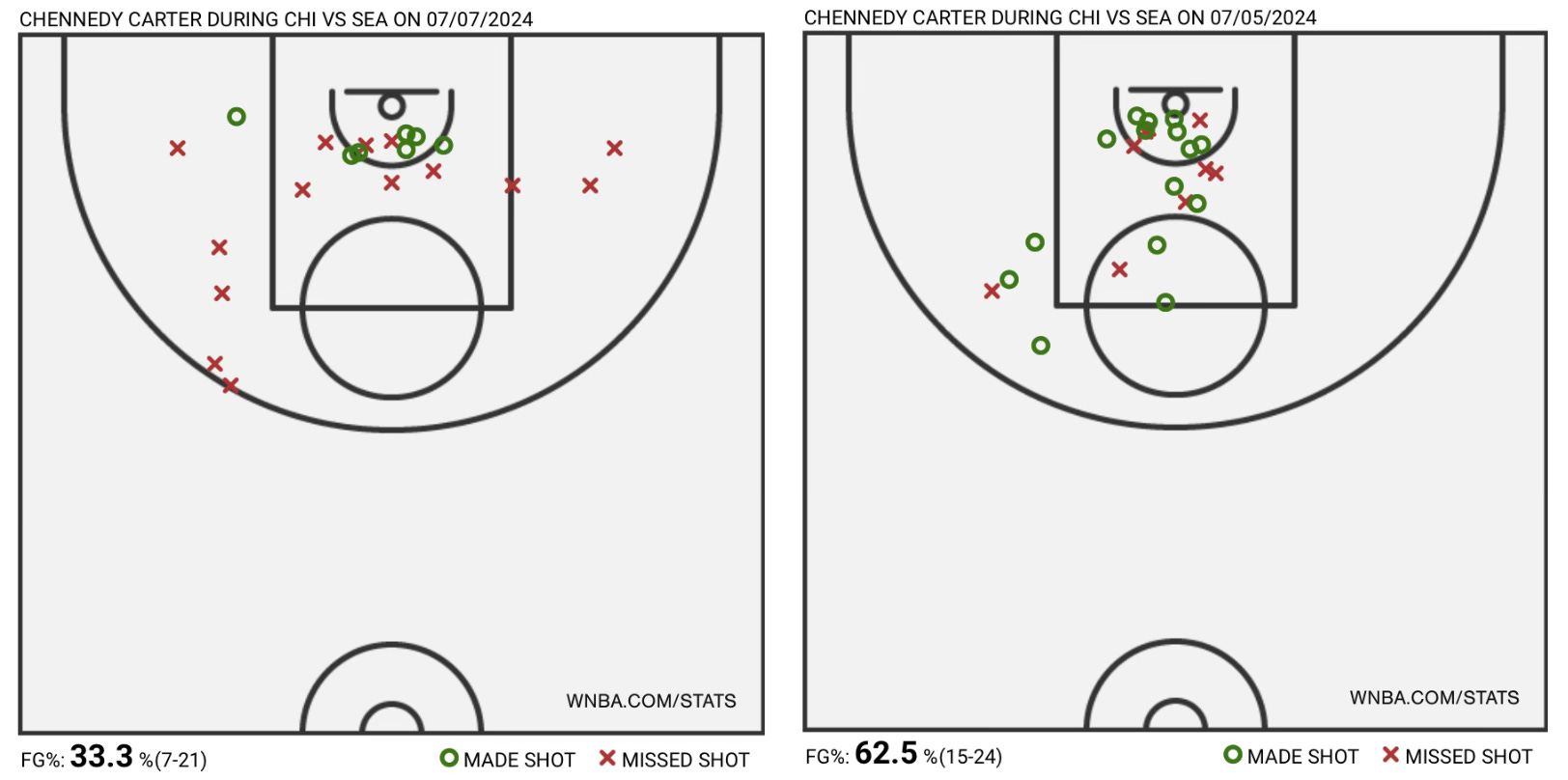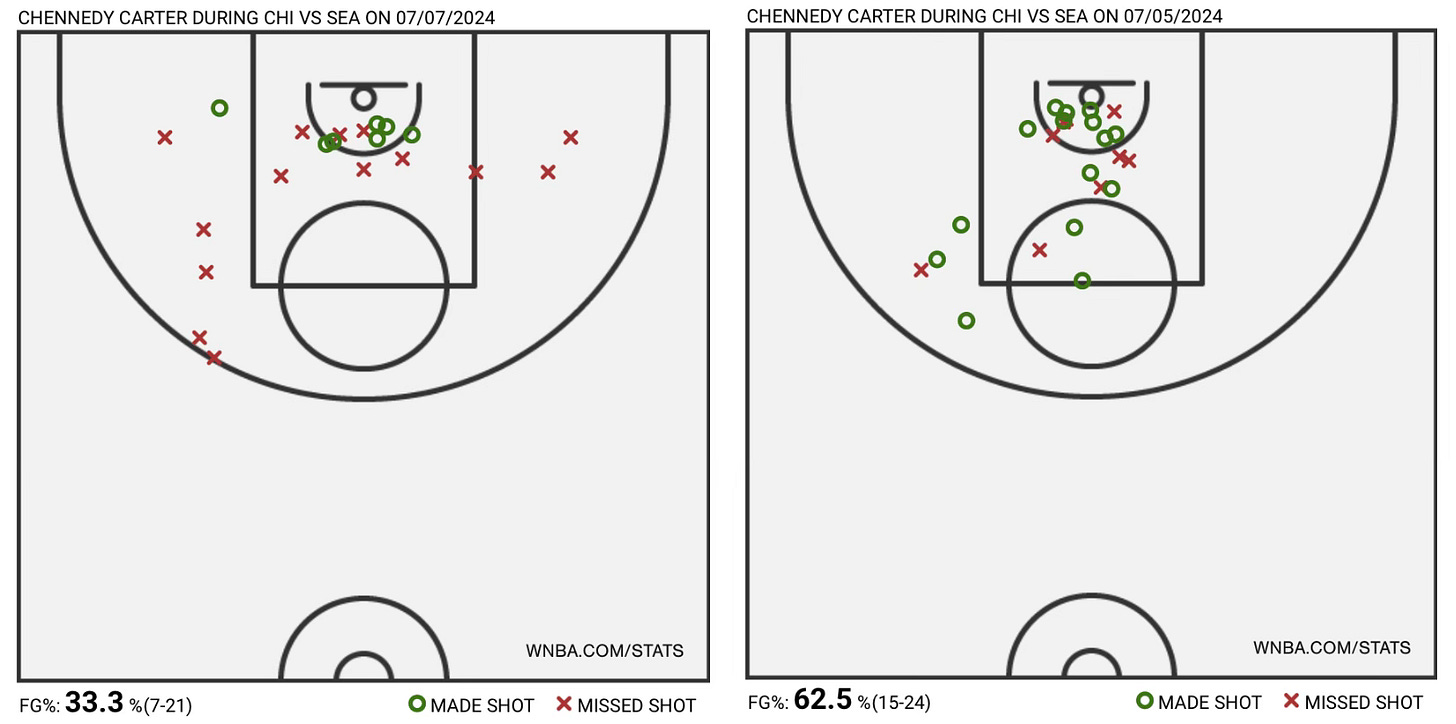 That said, if Carter got some more favorable rolls or simply found her zone offensively, there are still plenty of shots on that chart she’d back herself to make. In other words, it’s not as if what the Storm did means that other teams can now work to frame Carter out of the game in the same way. However, this game should force the Sky to think more critically about their offensive strategy—knowing that they can’t count on Carter to be dominant every single night. If she does struggle to make shots, the Sky need to be able to rely on other players to shoulder the burden—with Carter sliding into a playmaking role. If she has the freedom to do that and defenses respect the other scorers, Carter will eventually be freed up to attack off the dribble once again and find those central scoring areas where she was so dominant on Friday (and has been throughout most of the season). As for the Sky’s overall offensive approach, I don’t think tonight’s game requires any deeper analysis. Carter will continue to be their number one option and primary closer—a night where the opposing defense tightens up and shots don’t fall shouldn’t change that. What it does require them to rethink is what they do when Carter isn’t at her best.
